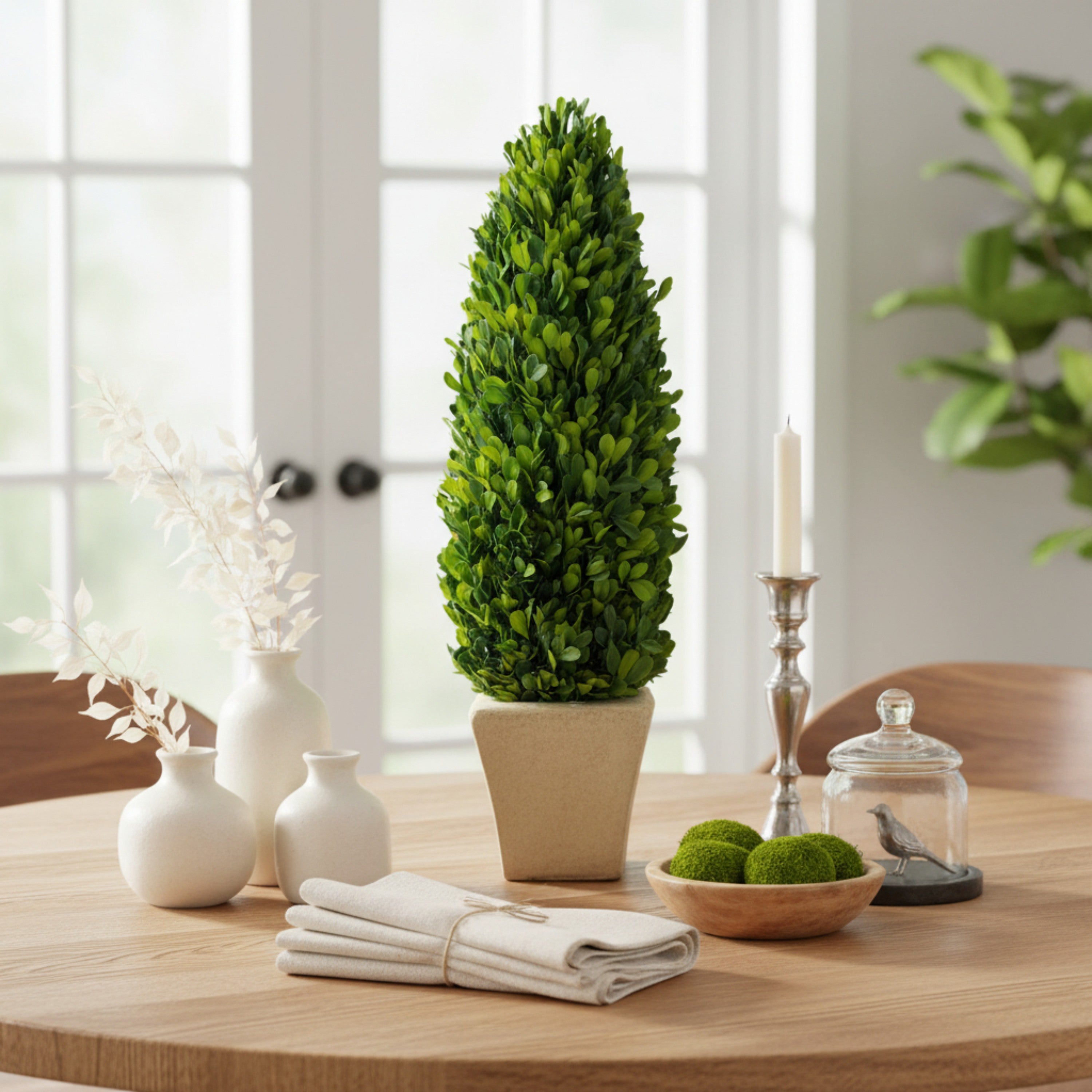 Add timeless greenery to your home with this 20" Preserved Cone-Shaped Boxwood Topiary. Featuring lush, preserved boxwood columns elegantly arranged in a terracotta pot, this topiary offers the look of real plants with no maintenance required. Crafted from high-quality materials, it retains its vibrant green color for years. Available in multiple sizes to perfectly complement any room or décor style.