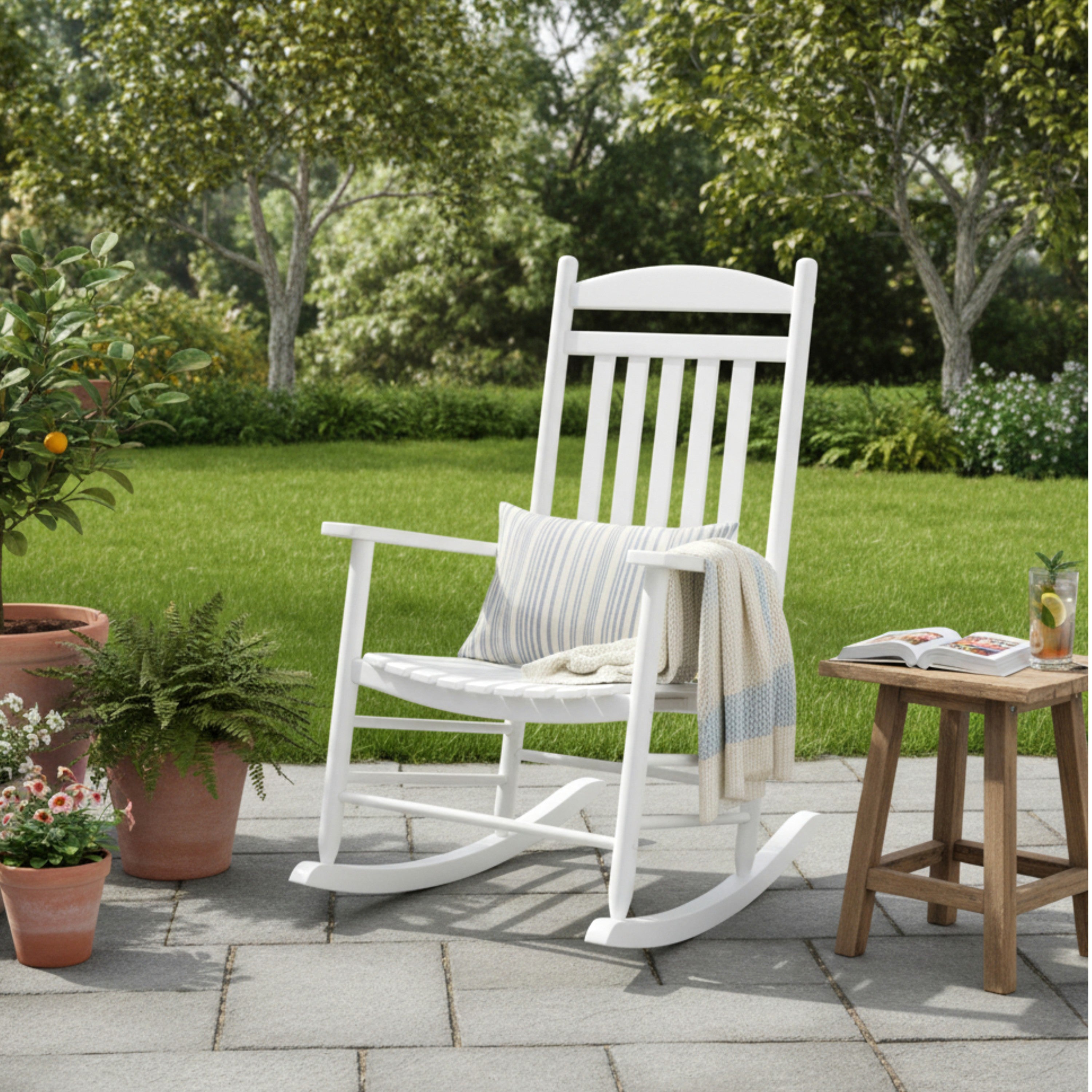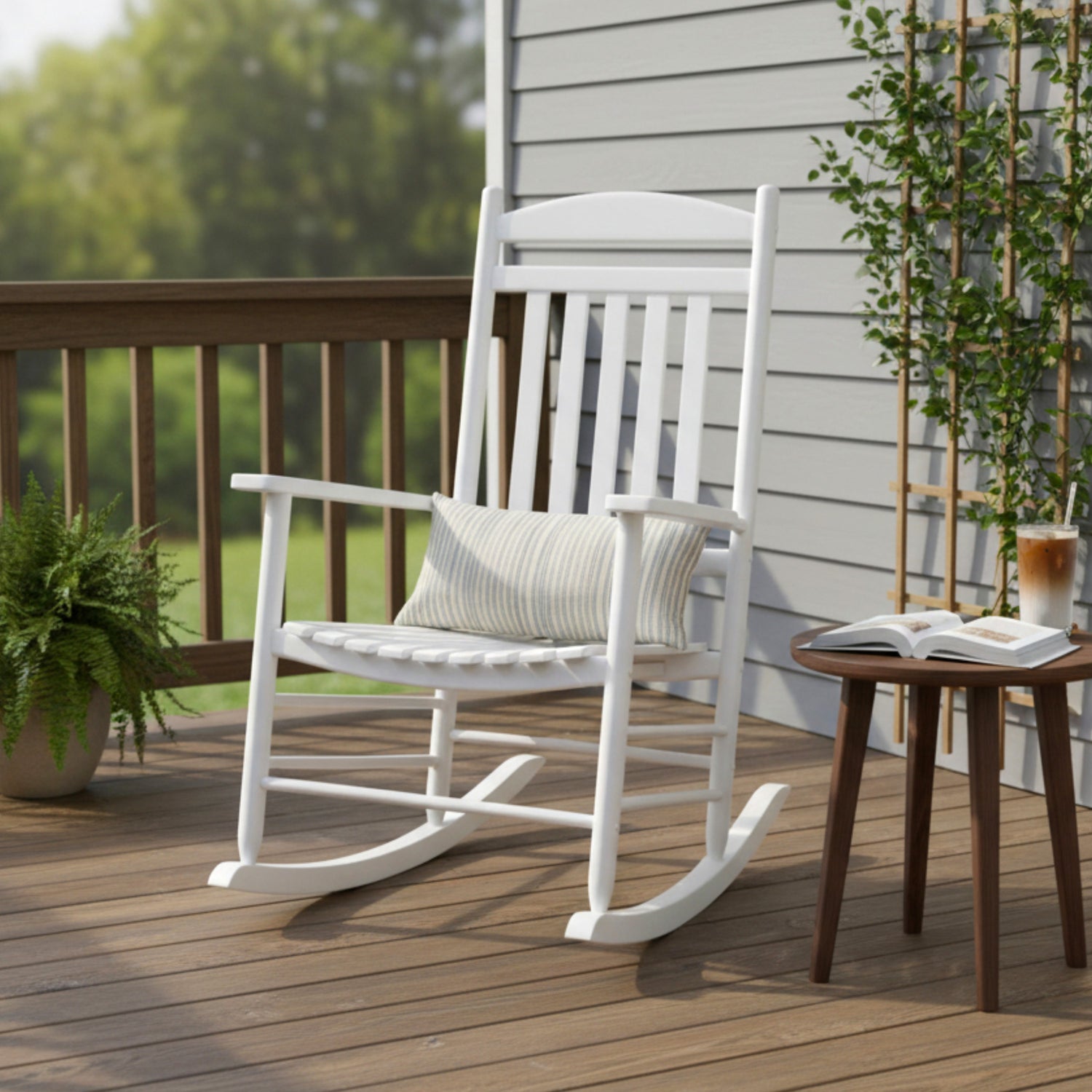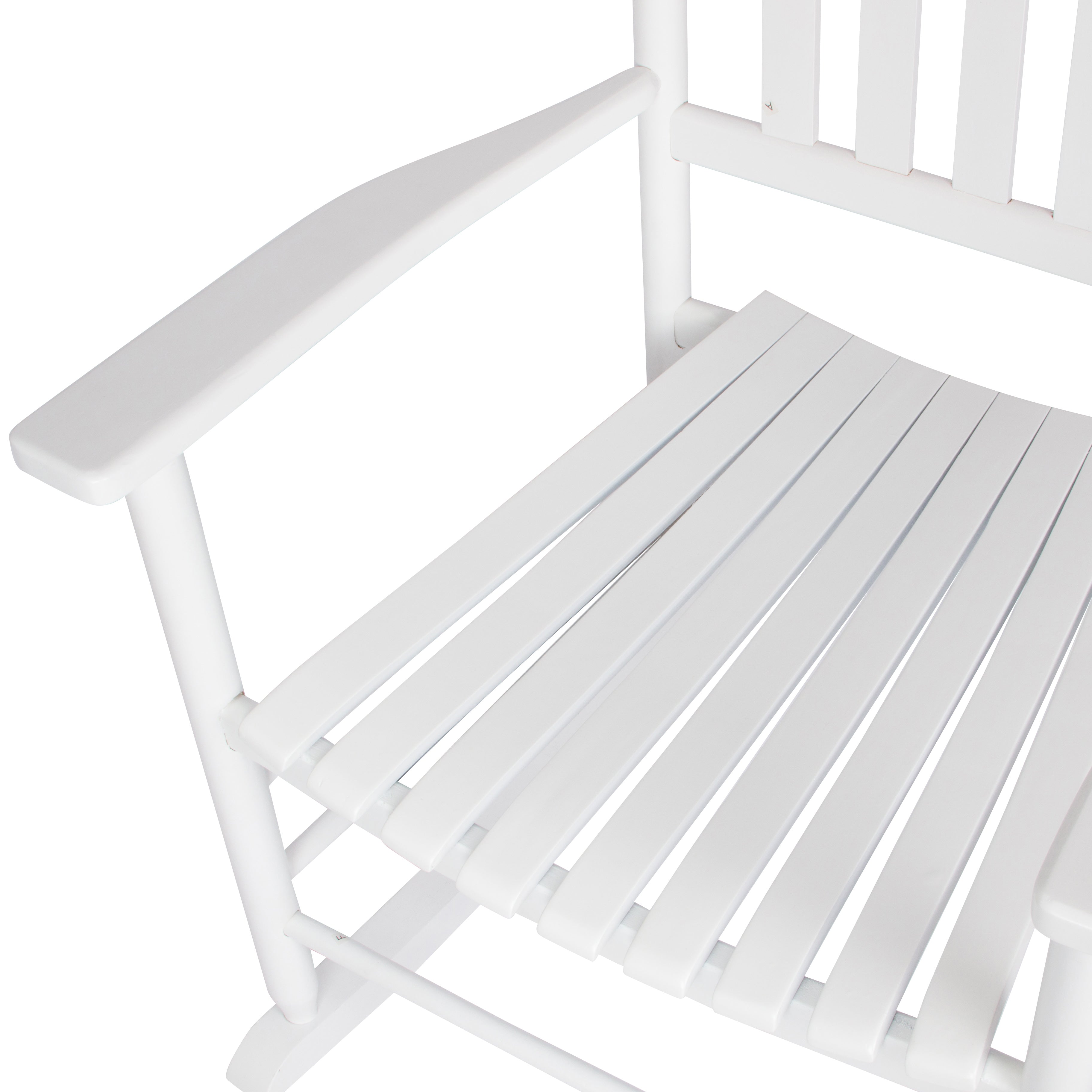 Constructed of hardwood and strong enough to withstand the elements without sacrificing the classic look you love, this rocker has vertical slats with beautiful, curved detailing making it the perfect accent piece to any front porch, walkway, garden, or deck.