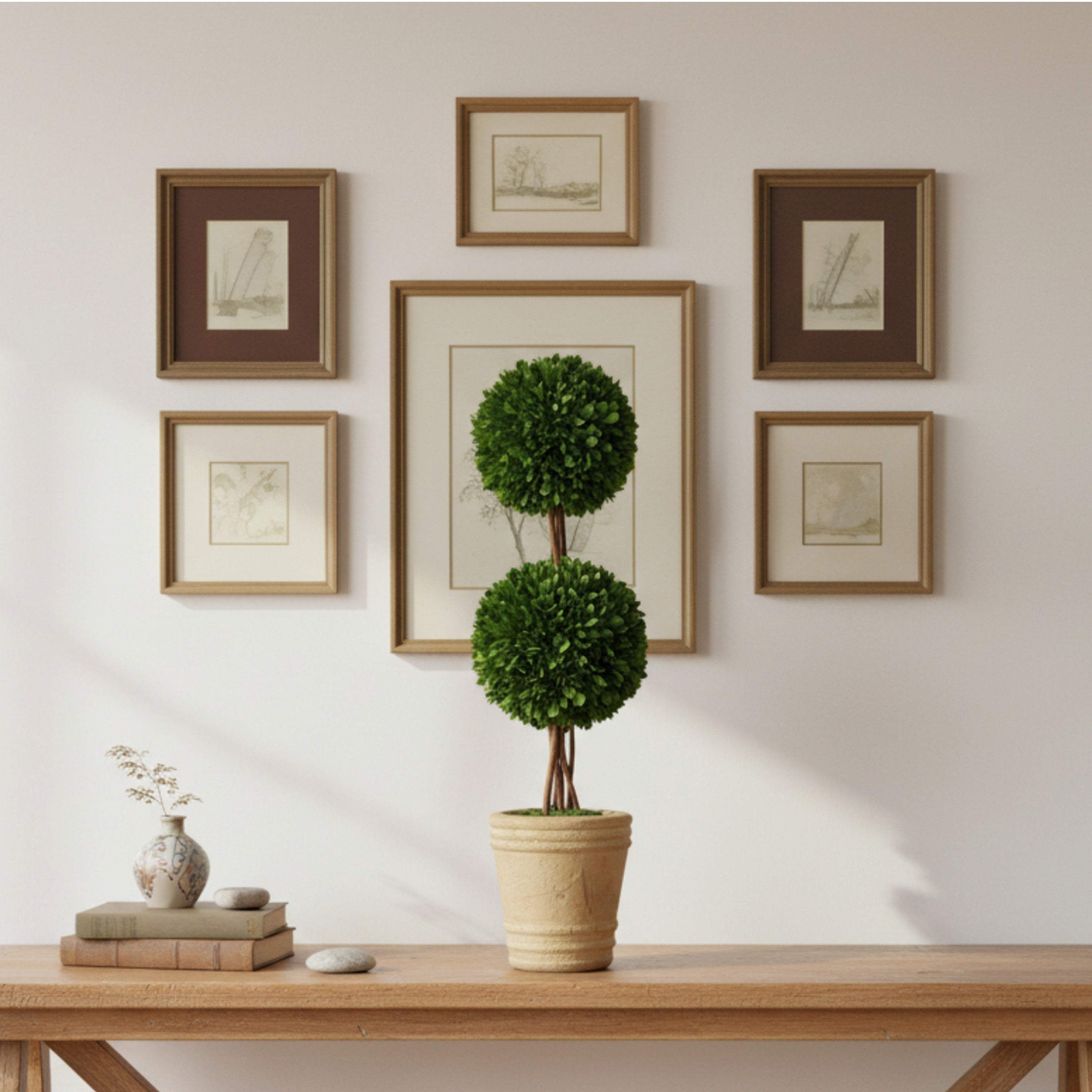 Add timeless greenery to your home with this 20" Preserved Boxwood Double Ball Topiary. Featuring two lush, preserved boxwood balls elegantly arranged in a terracotta pot, this topiary offers the look of real plants with no maintenance required. Crafted from high-quality materials, it retains its vibrant green color for years. Available in multiple sizes to perfectly complement any room or décor style.