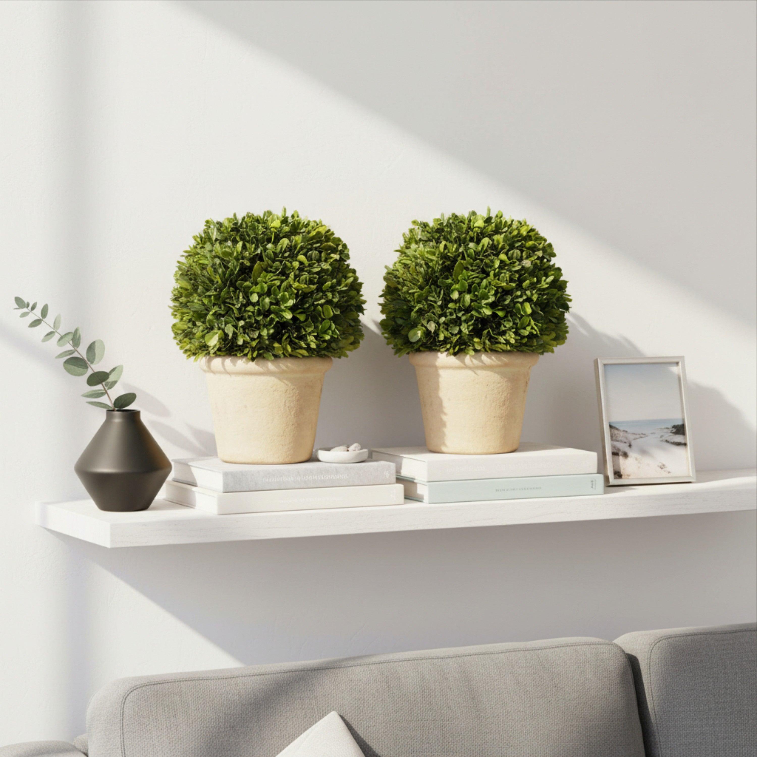 Meticulously handcrafted from the finest real boxwood, these 8" Preserved Boxwood Topiary Plants maintain a vibrant green hue and the authentic look of fresh foliage with minimal maintenance. Designed to deliver lasting natural beauty, they add a classic, timeless touch to any home, office, or special event décor. Perfect for tabletops, planters, or decorative displays, these boxwood topiaries offer effortless style year-round.