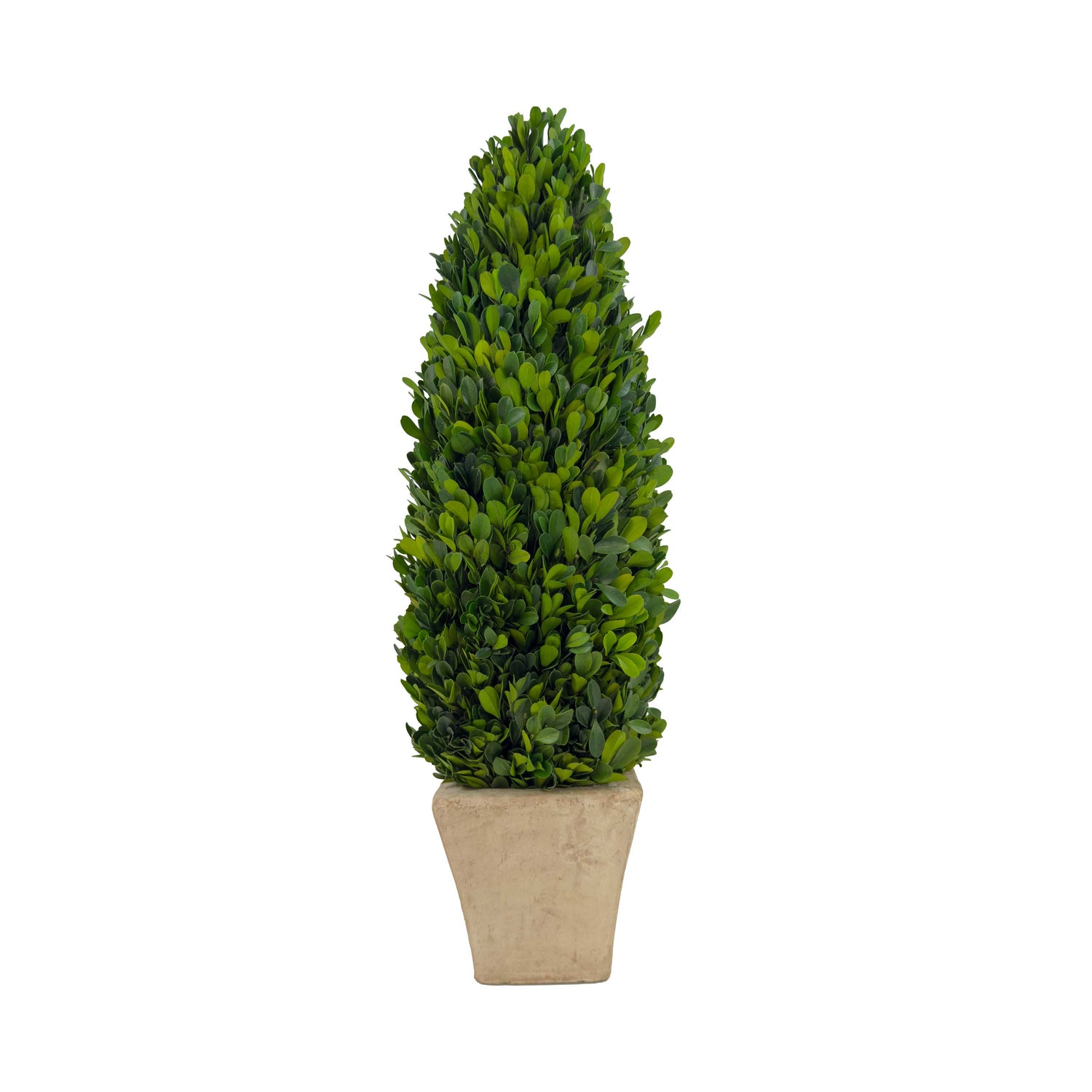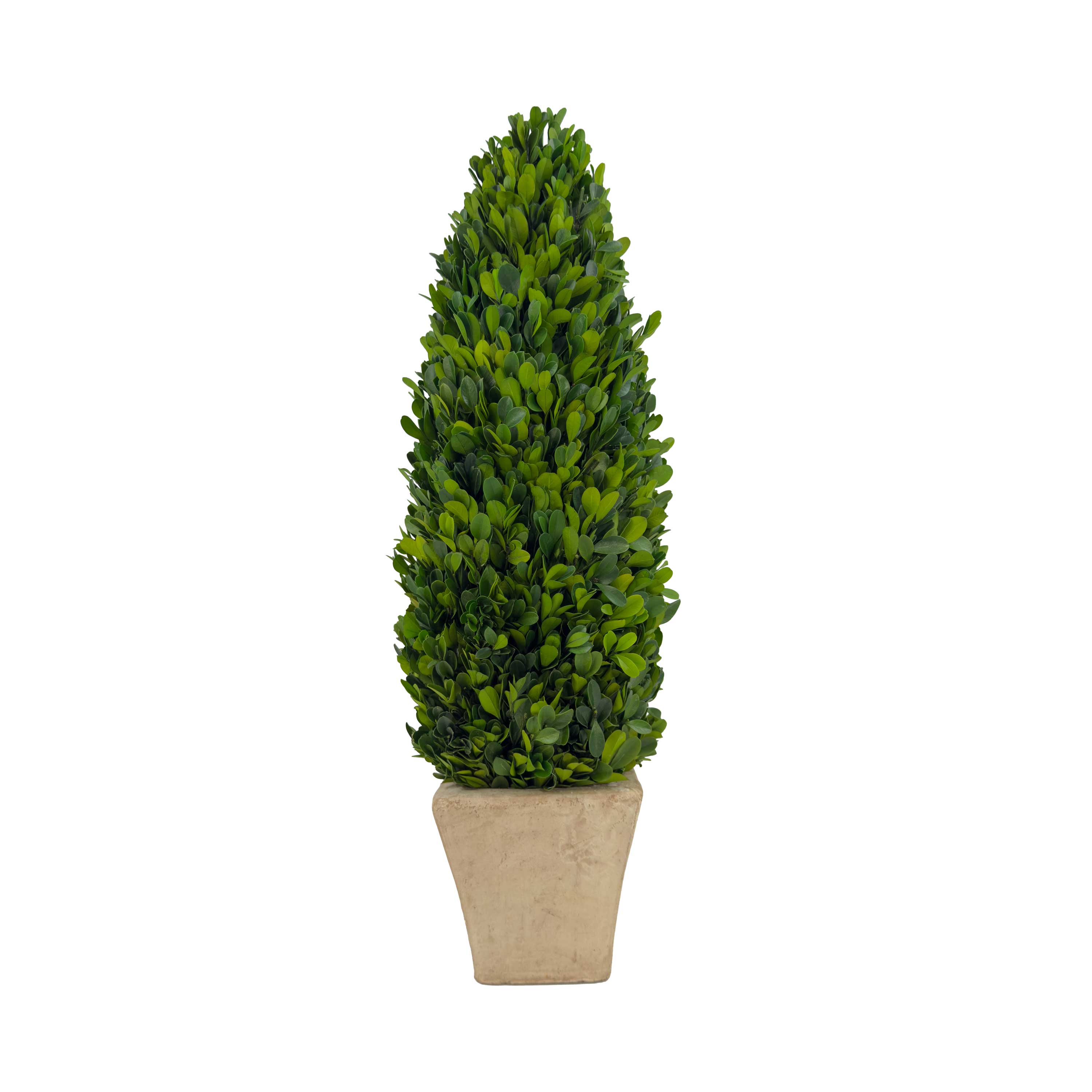 Add timeless greenery to your home with this 20" Preserved Cone-Shaped Boxwood Topiary. Featuring lush, preserved boxwood columns elegantly arranged in a terracotta pot, this topiary offers the look of real plants with no maintenance required. Crafted from high-quality materials, it retains its vibrant green color for years. Available in multiple sizes to perfectly complement any room or décor style.