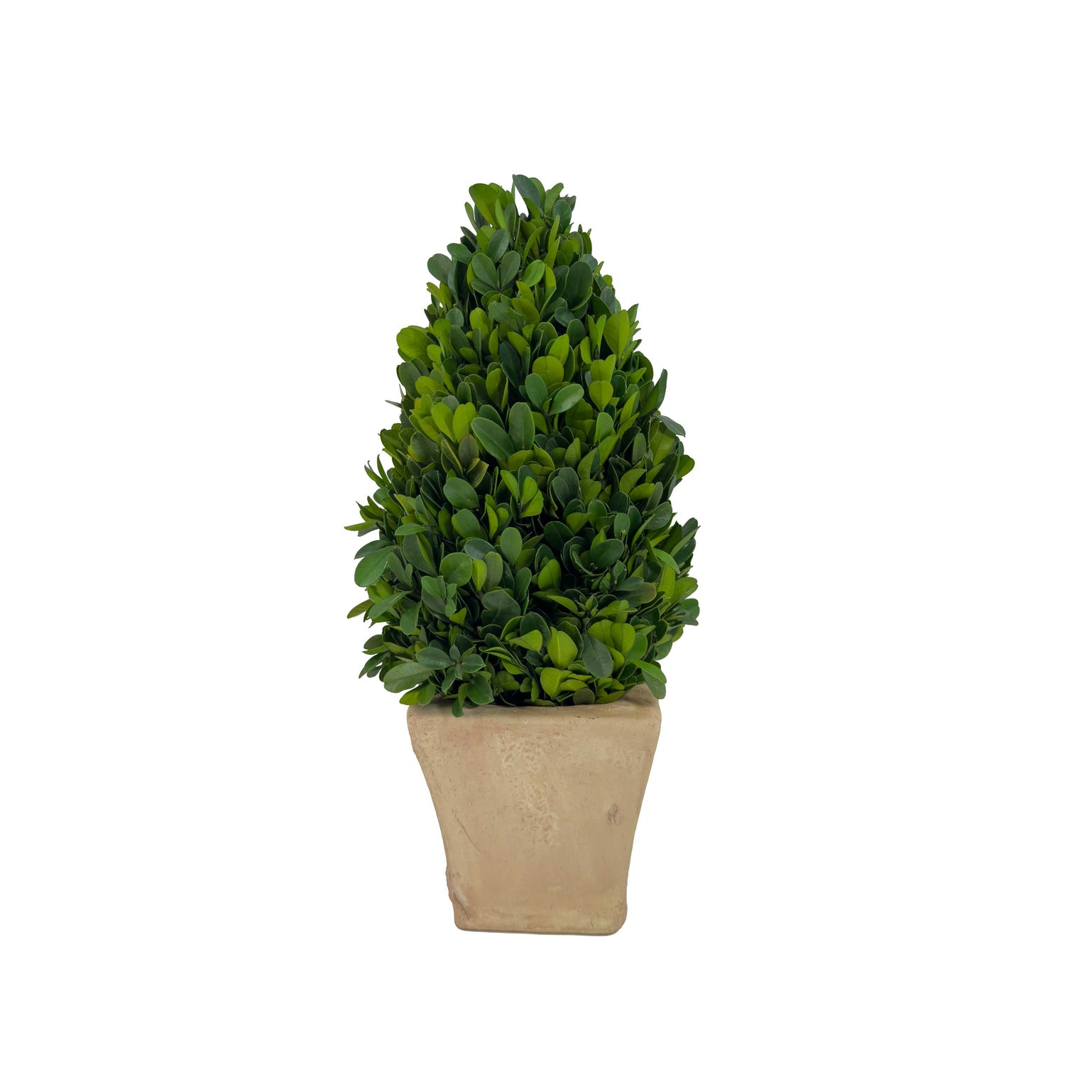 Add timeless greenery to your home with this 12" Preserved Cone-Shaped Boxwood Topiary. Featuring lush, preserved boxwood columns elegantly arranged in a terracotta pot, this topiary offers the look of real plants with no maintenance required. Crafted from high-quality materials, it retains its vibrant green color for years. Available in multiple sizes to perfectly complement any room or décor style.